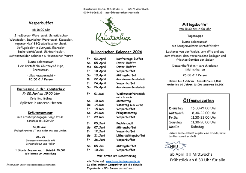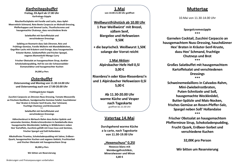 Kulinarischer Kalender April – Juni 2026 Fr 03.April Karfreitags Buffet Wir bitten um Reservierung Zu allen anderen Zeitpunkten gilt die aktuelle Tageskarte – Wir freuen uns auf euch |